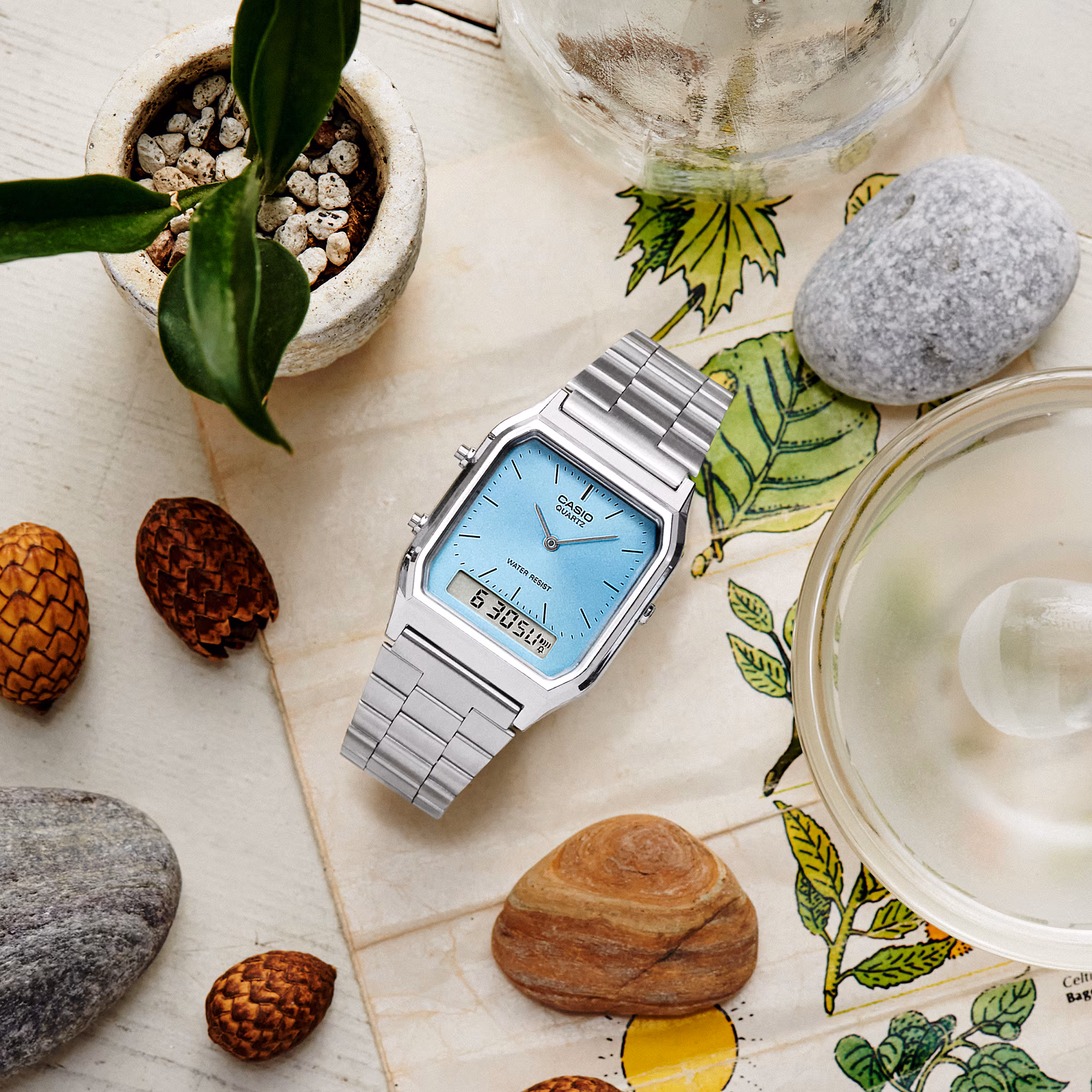 O AQ-230A-2A1MQY destaca-se pelo seu perfil compacto e pela fusão entre o estilo retrô e a funcionalidade moderna. A bracelete metálica e o acabamento prateado conferem-lhe um aspeto urbano e versátil, ideal para quem procura um relógio discreto mas com personalidade. Perfeito para uso diário, pequenos passeios ou contextos informais — é uma escolha equilibrada para quem valoriza simplicidade, praticidade e estilo vintage com um toque contemporâneo.